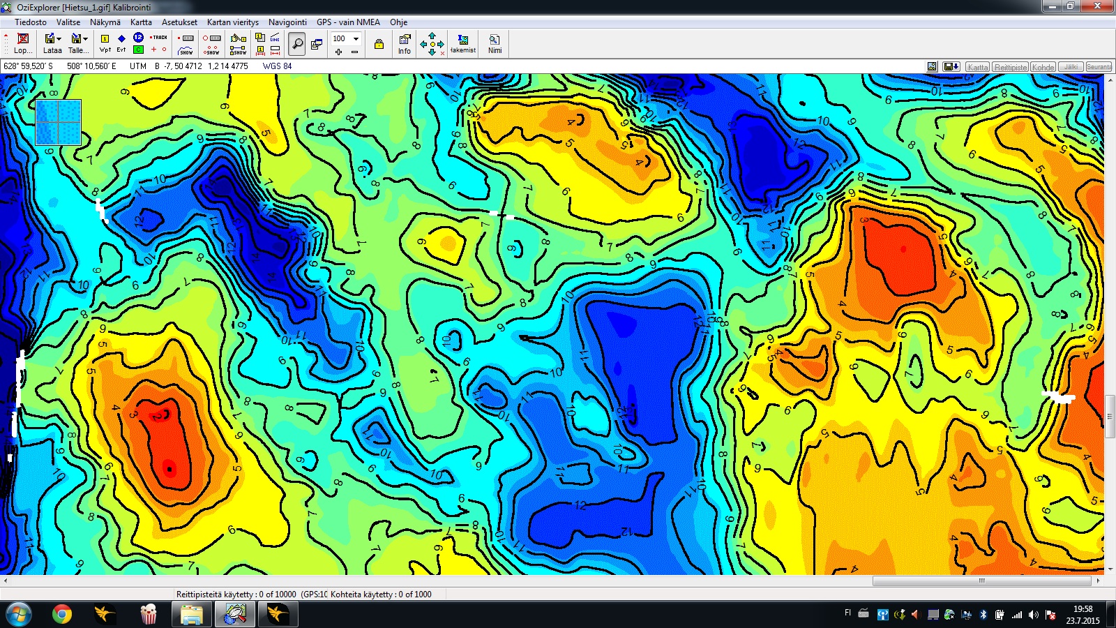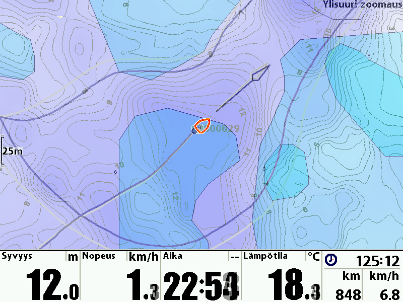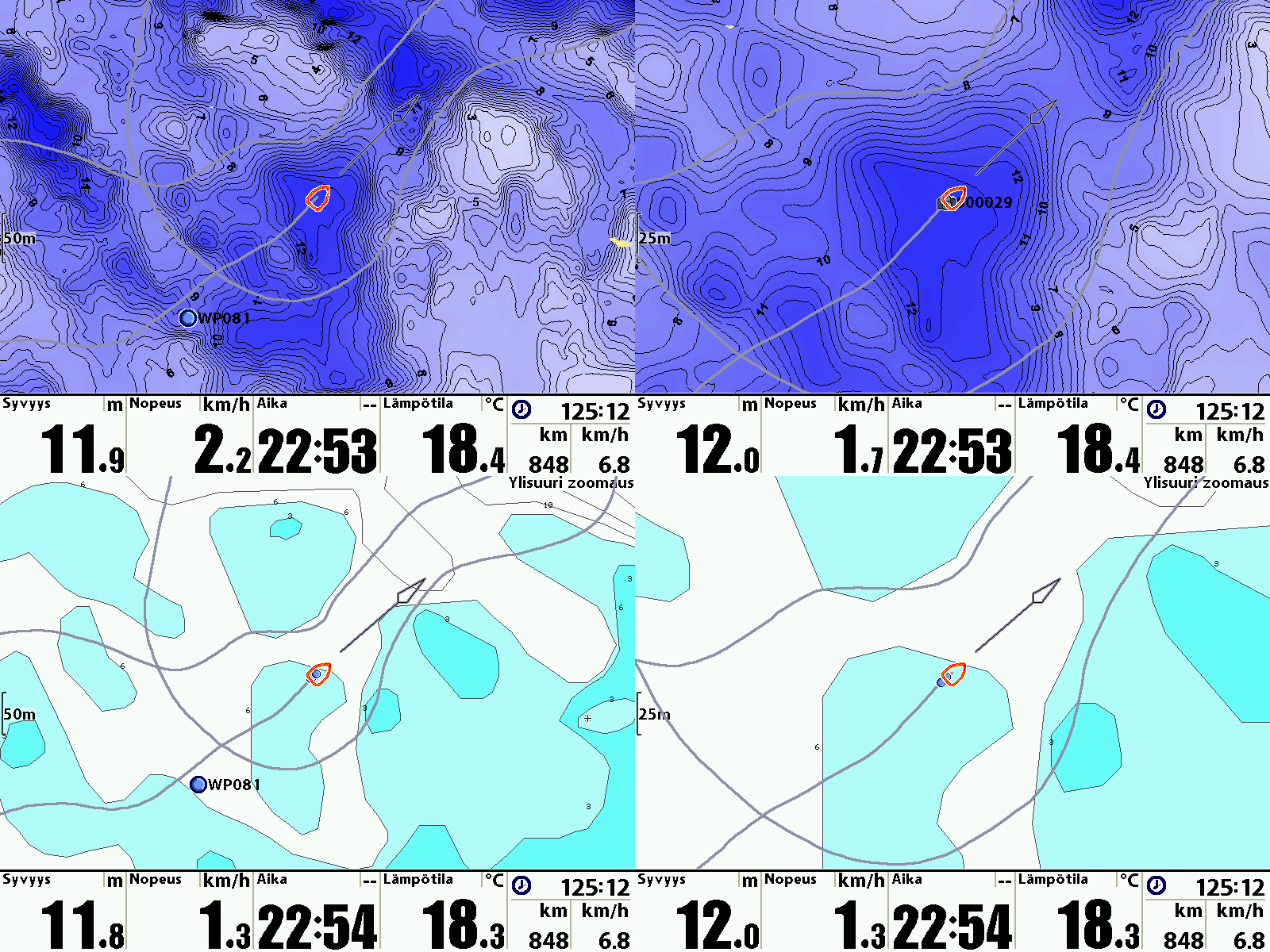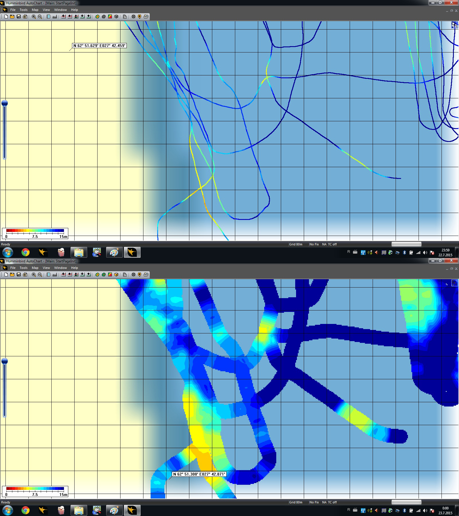 Tämä on lopullinen datasta saatava informaation määrä. Kun kartat päivitetään sitä varten olevalle muistikortille, ohjelma tekee myös syvyyskäyrät. Ohjelmassa voidaan käyttää näkymää jossa on pällekkäin väreinä olevat syvyydet ja syvyyskäyrät, plotterille siirrettäessä värit ovat vain sinisen sävyjä mutta syvyyskäyrät näkyvät plotterissakin.