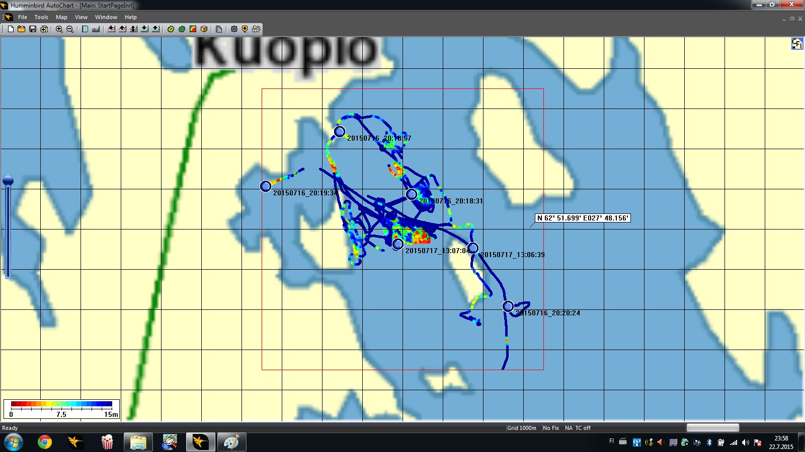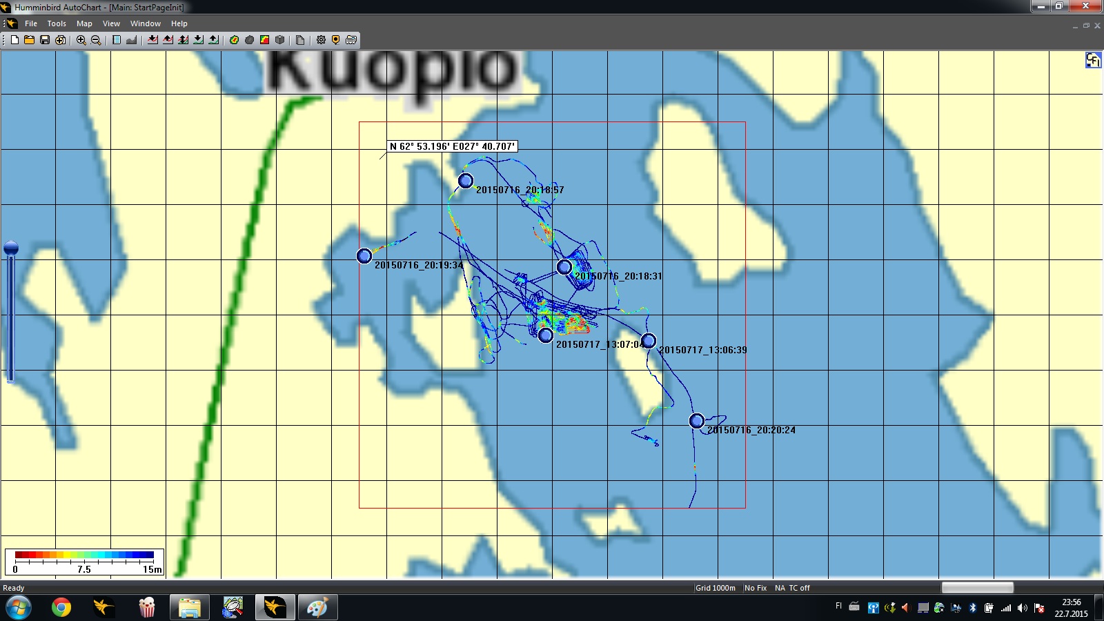Kauden aluksi hommasimme Humminbirdin viistoluotainkombon ja olimme selvittäneet valmiiksi että myös sillä voi tehdä omia karttoja luotausdatasta muiden merkkien tavoin. Humminbirdin ohjelma ei ehkä ole niin tunnettu kuin esimerkiksi Lowrancen vastaava ja monella se on saattanut jäädä kokonaan huomaamatta ja näin ollen hyödyllinen ominaisuus jäänyt vaille käyttöä.