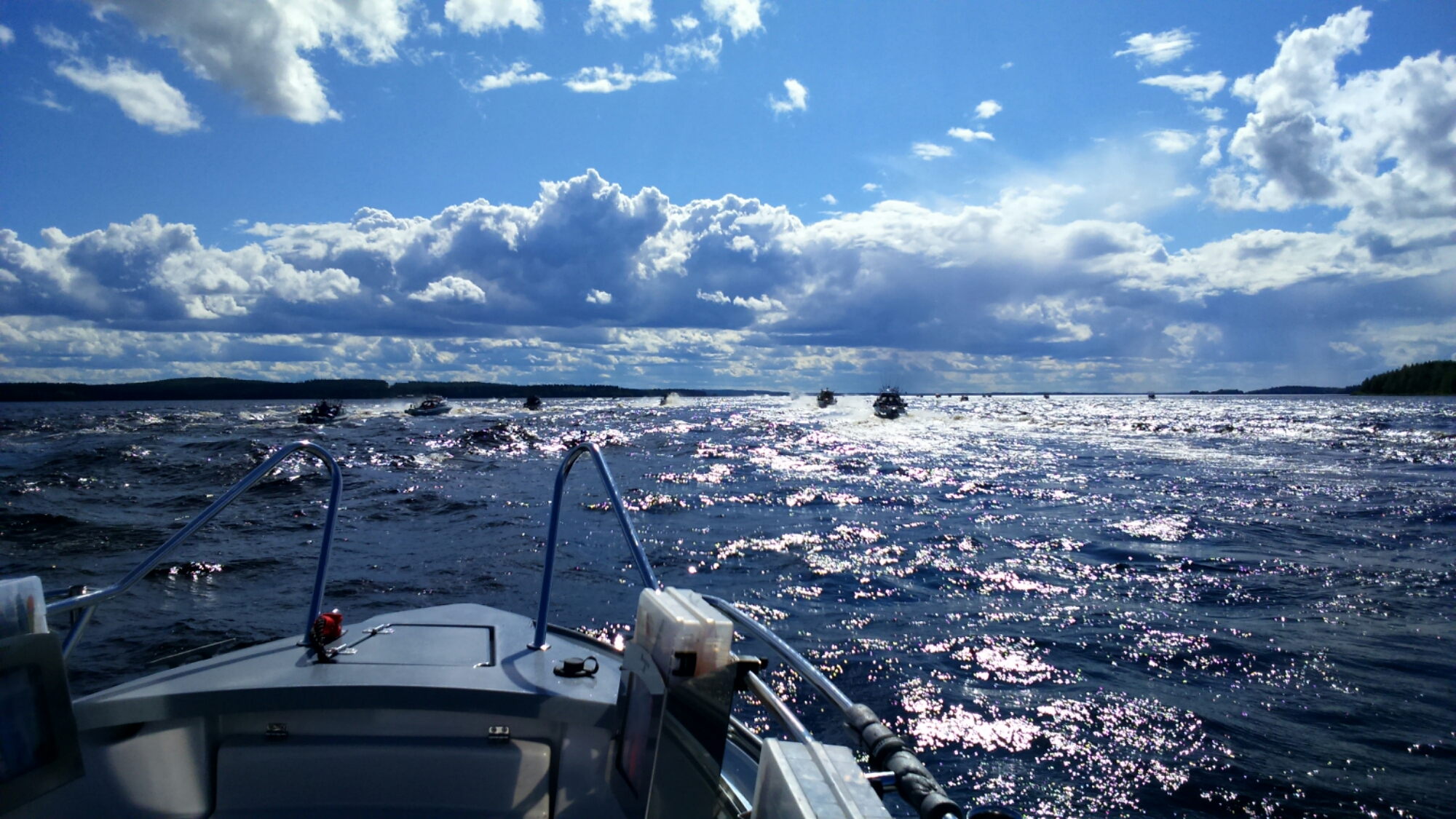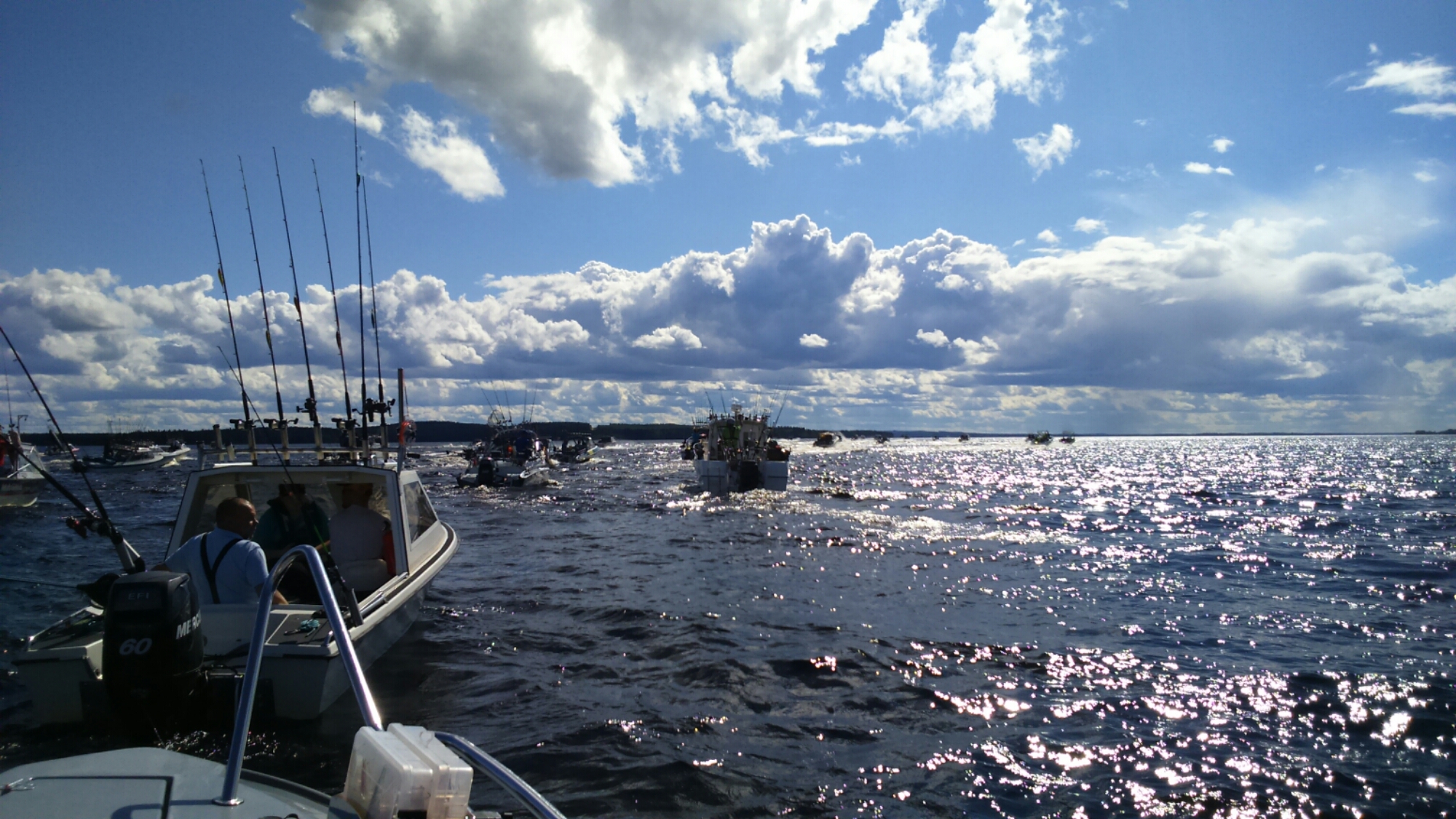 H-hetki ja lauantaiaamu. Kilpailuun oli ilmoittautunut matkaan 122 venekuntaa. Vakioperämies Heikki kyytiin ja aloimme ynnäillä kisapaikkaa. Sen verran näytti keli vaikealta, että emme vielä kisastartissakaan olleet paikasta varmoja. Läksimme ajamaan Pyhäsaarelle päin ja päätimme matkalla katsoa kummalle puolelle menisimme. Tuulet puhalsivat suoraan pohjoisesta 6-9ms ja alla oli 4,7m yamariini. Tuumasimme että vedämme nämä meidän ”varmat paikat” kertaalleen myötä vetona jos keli antaa siihen myöden eikä muita veneitä jäisi linjalle kovinkaan montaa, tässä säässä kun ei tuo väistely oikein hotsittanut. tarkoitus oli siirtyä suojan puolelle sen jälkeen.. Yllätykseksemme paikkaan jäi vain kourallinen veneitä ja aloitimme sitten kuitenkin siitä,