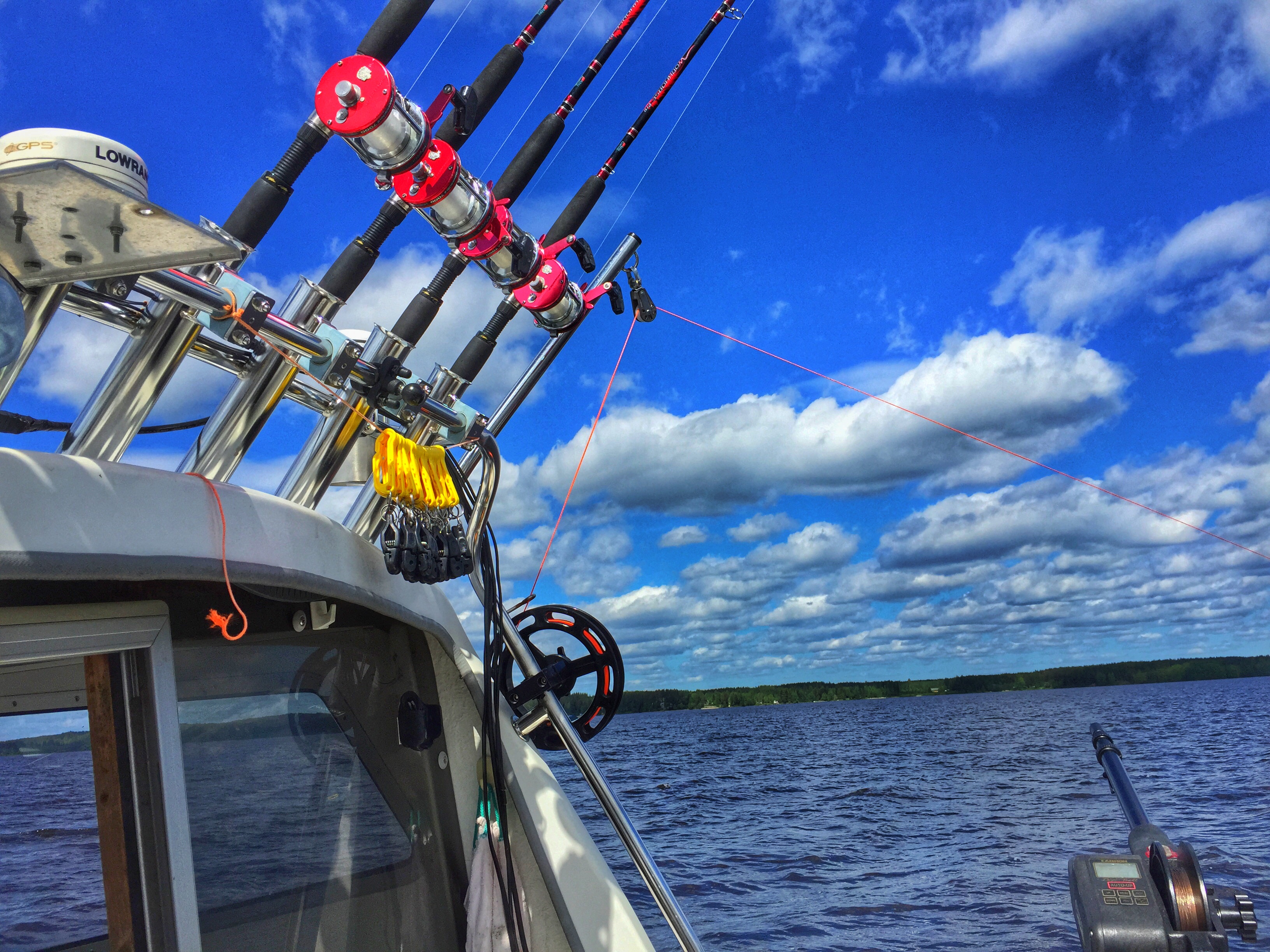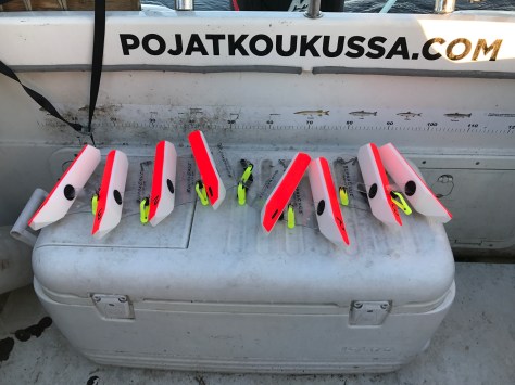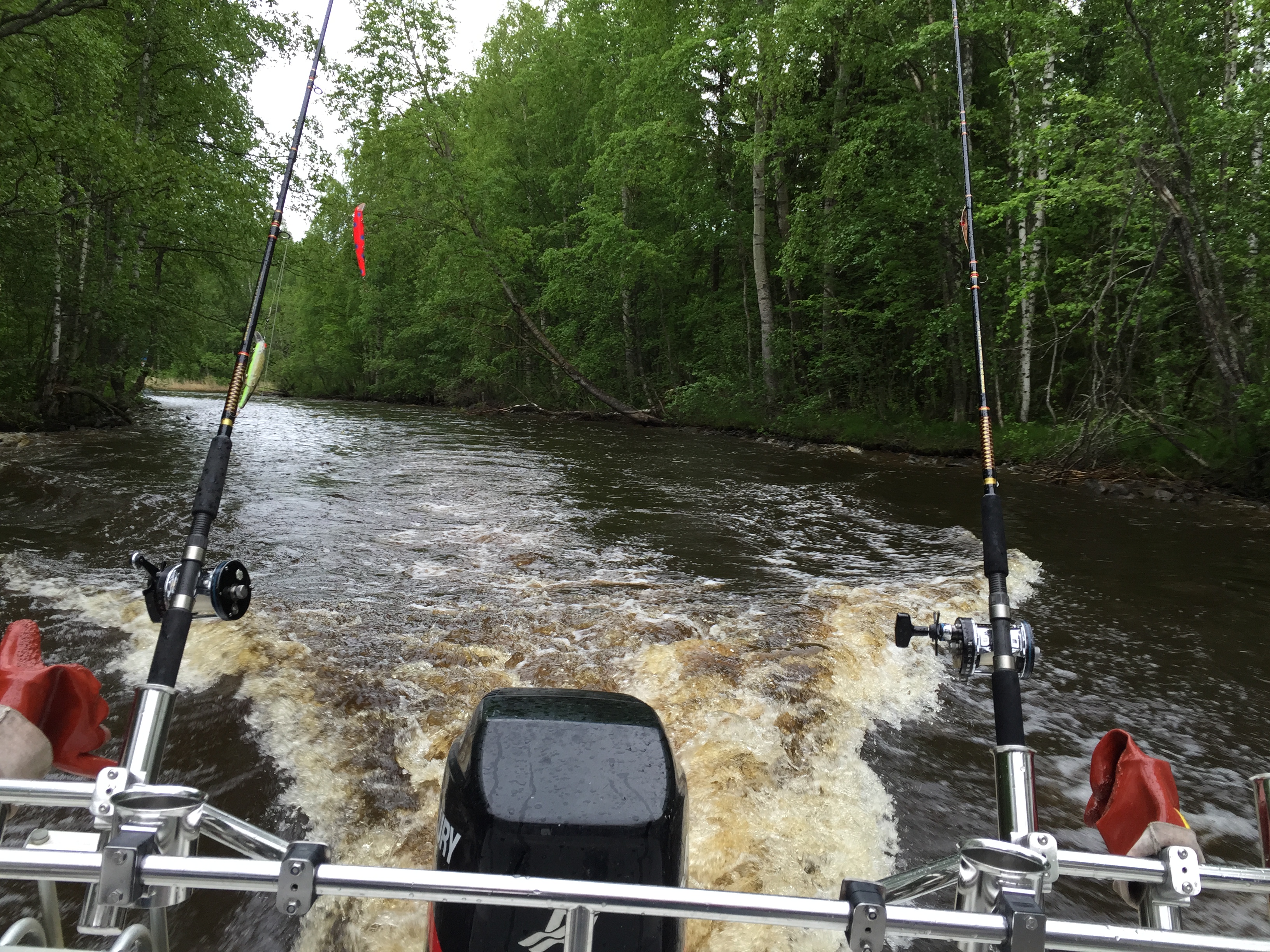 Käännyimme nopeasti takaisin samalle linjalle ja laskimme edestä kelaamiamme vieheitä takaisin vetoon, kun samassa yksi kelkoista alkoi pakittaa ja räikkä pikkaisen napsuttaa. Ana tarttui vapaan ja ryhtyi kelaamaan samalla miettien onko siellä kalaa ollenkaan. Todettuaan, että kyllähän siellä jonkinlainen kala on, hän jatkoi kelaamista samaan tahtiin ja 6.8kg lohi tuli plaanissa kyytiin. Loppupäivän pyörimme pitkälti samoilla paikoilla, mutta uutta tärppiä ei enää tullut. Tämä ei tunnelmaa päässyt latistamaan, vaan tyytyväisinä lähdimme mökille vetämään lohia fileiksi. Vakuumimestari Hassinen vielä vakuumipakkasi fileet ja homma venyi pikkutunneille saakka. Kuten arvata saattaa, kaatoryyppyjä tuli otettua pariin kertaan.