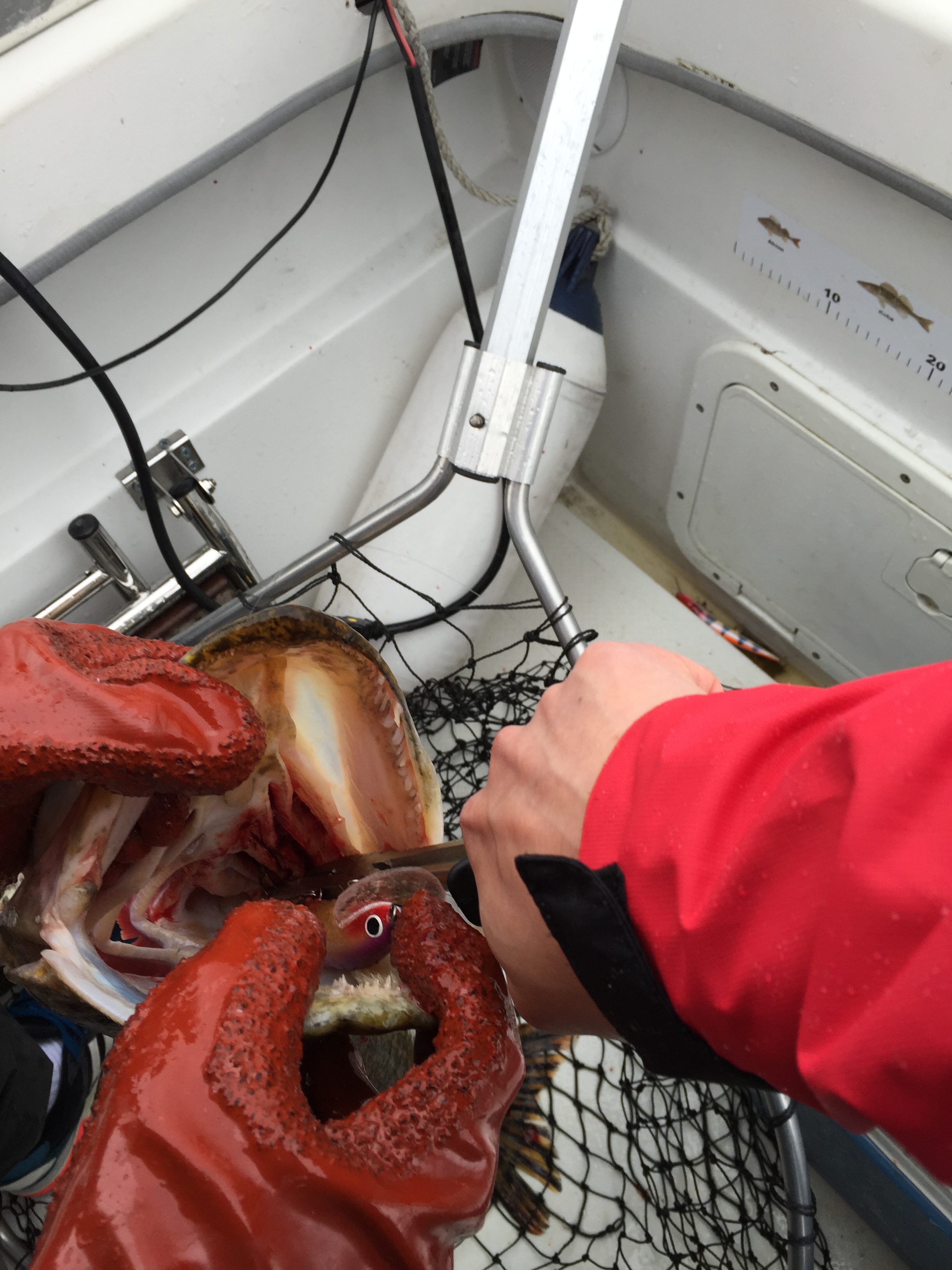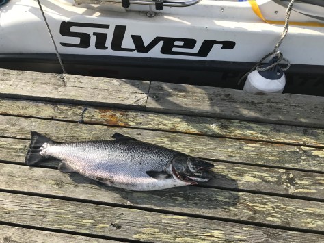 Vihdoin illalla noin puoli kymmennen aikaan kuulimme sen äänen mitä oli jo kaivattu, räikän pärinän, n. 45h tyhjän vetoa takana ja usko koetuksella mutta nyt se olisi kiinni. Vähän aikaa tilannetta ihmetelessä vapa käteen ja Hene vavan varteen koska hänelle oli annettu ensimmäinen kelausvuoro. Kala lähti ylimmästä takilasta joten siimassa ei ollut mitään ”ylimääräistä”, eli hyvä aloituskala koska kenelläkään ei ollut juurikaan aiempaa kokemusta merilohen uistelusta. Aluksi kala vei jonkin verran siimaa ja otti pari komeaa hyppyä, mutta tuli kuitenkin yllättävän helposti kohti venettä. Haavimiehen virkaa toimitti Tomi ja Tomi saikin hienosti napattua kalan cummingsiin. Ongelmaksi osoittautui haavin havas, jota emme vaihtaneet syvempään malliin, sekä kalan paino. Tomi ei saanut heti suljettua havasta kunnolla, joten kala oli vielä vaarassa pudota takaisin mereen. Videolla voitte kuulla Tomin huutavan ”auttakkee auttakkee” ja tästä huudosta Tomia piikiteltiin koko loppu matka :)