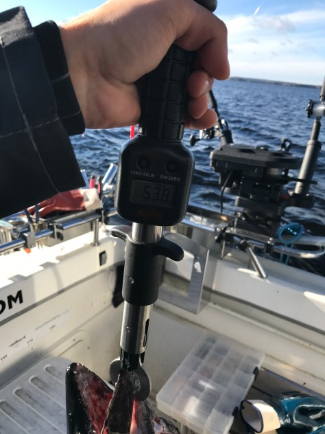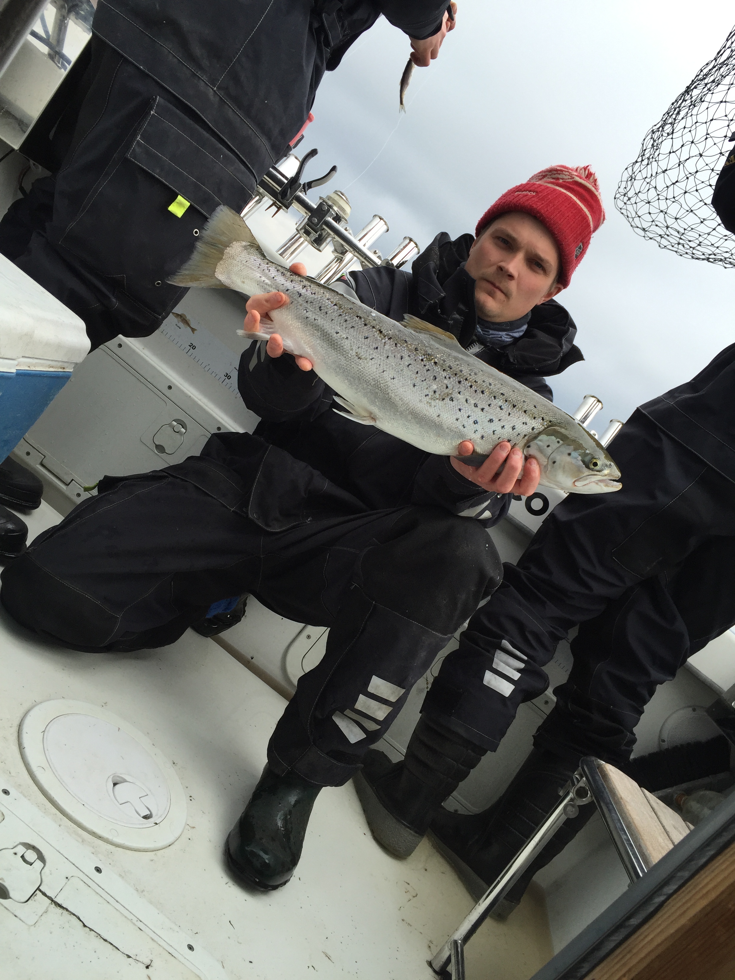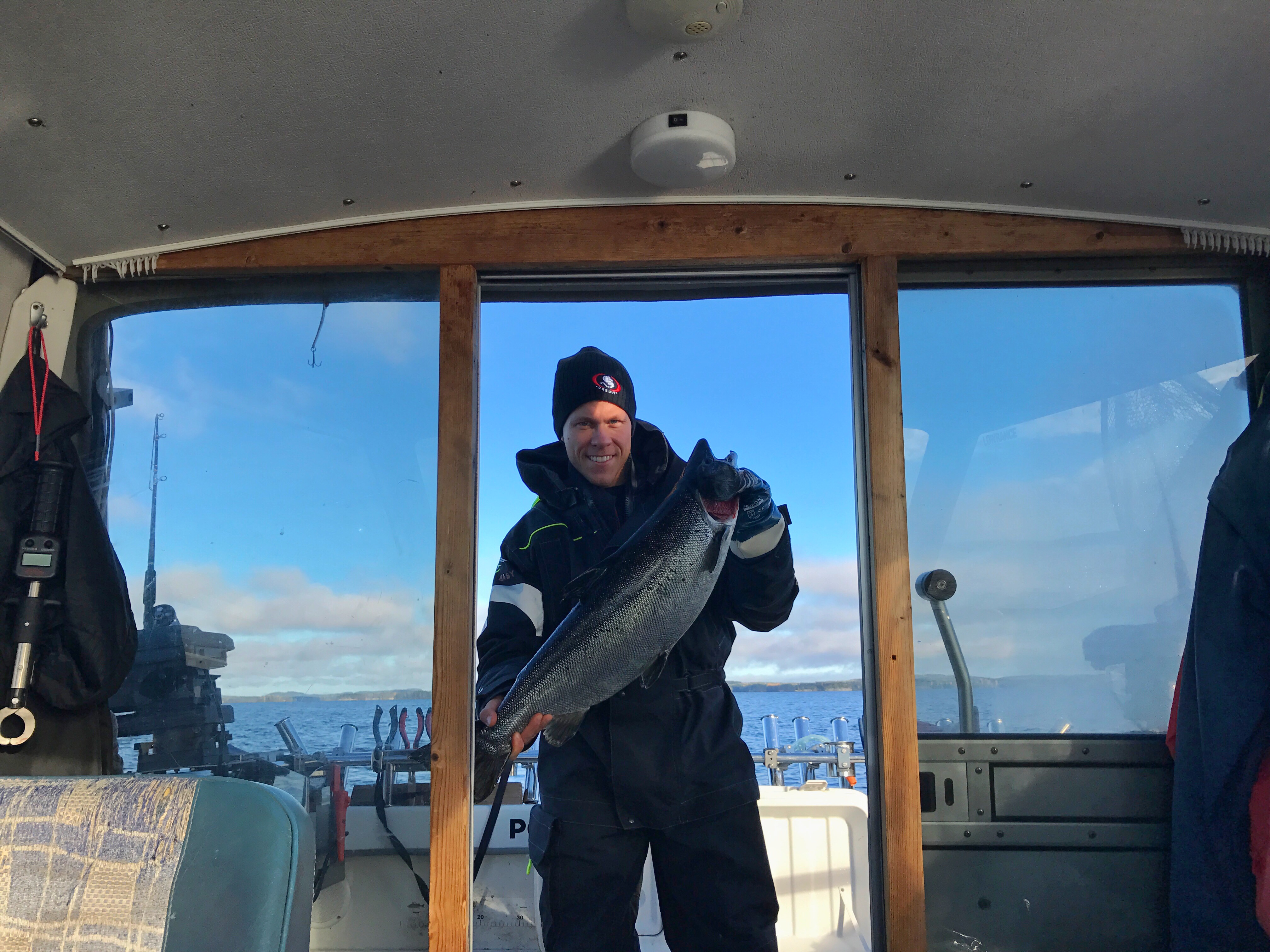 Noin puolessa välin matkaa klo 16 aikoihin aloimme tylsyyteemme katselemaan YouTubesta videoita ja melkein heti alkoi räikkä päristä. Ainoa joka kuuli pärinän oli Hene joka istui veneen takaosassa. Kala otti kiinni sivutönkköön, missä oli oranssi Dipsy Diver -syvääjä välissä. Kummastelimme taas kalan päätöstä valita lähimpänä venettä oleva syötti, kun radiosta kuulimme melkein järjestään kalan tulleen uloimpaan sivuvapaan. Kala oli jälleen todella lähellä venettä, mutta veti siimaa tasaisesti. Väsytysvuorossa oli Tomi, joka varmoin ottein pumppaili kalaa lähemmäs venettä. Kala otti muutamia vetoja lähellä venettä ja näimme, että nyt on isompi kyseessä. Haavimieheksi valikoitui kylmät hermot ja äärettömän itseluottamuksen omaava Ana, jolla tosin oli toinen jalka kipsissä, mutta se ei miehen menoa tuntunut haittaavan pätkääkään. Väsytys kesti kaikenkaikkiaan noin puolituntia ja kala alkoi olemaan valmis veneeseen. Kala taas nätisti haaviin, mutta haavin varsi sotkeutui sivuvapoihin ja Ana ei saanut sitä heti nostettua veneeseen. Ongelmana oli taas liian matala havas, mutta onneks kala saatiin kyytiin kun koko venekunta riensi auttamaan. 16kg lohi kyydissä ja venekunta onnellisena!