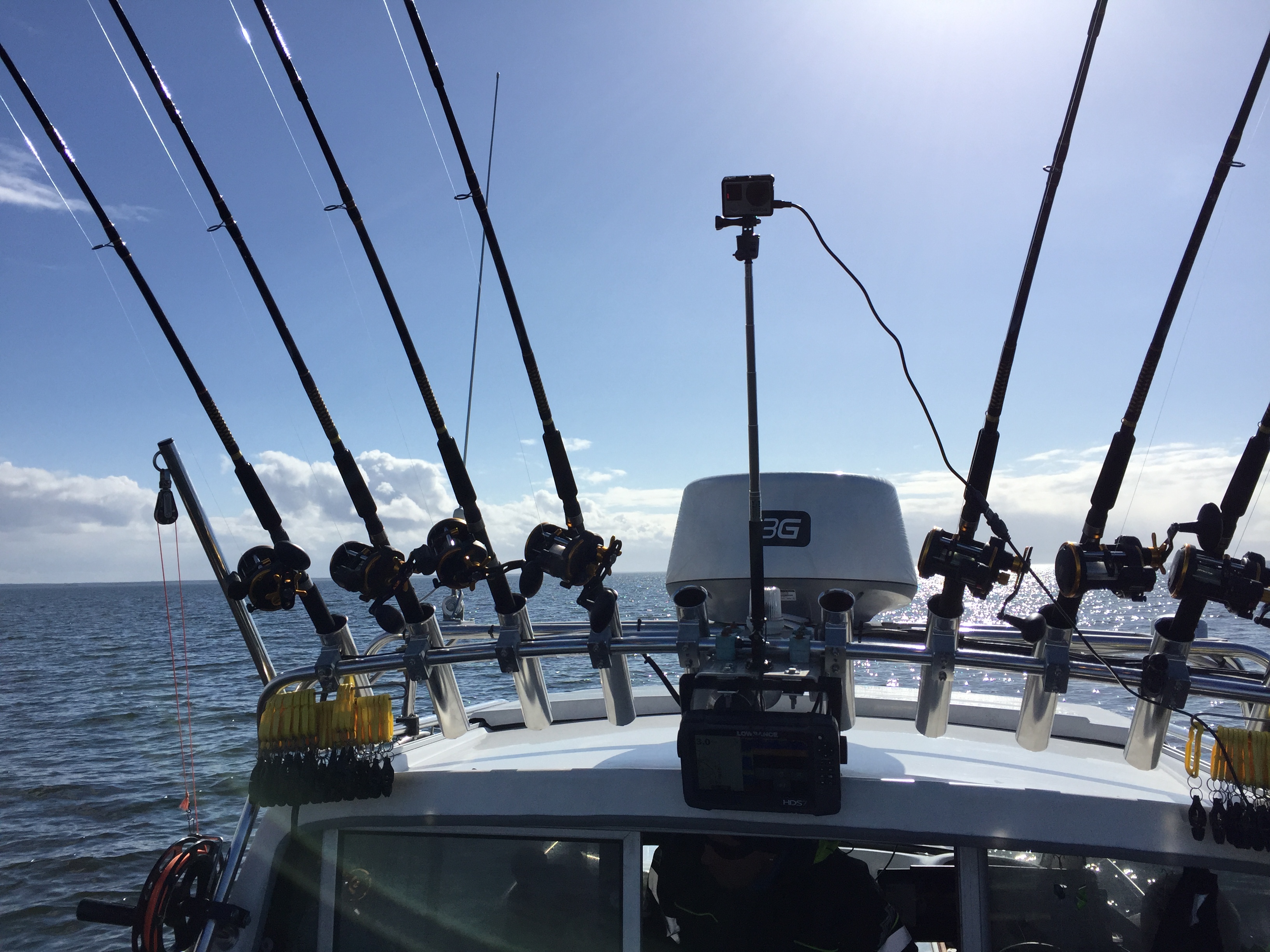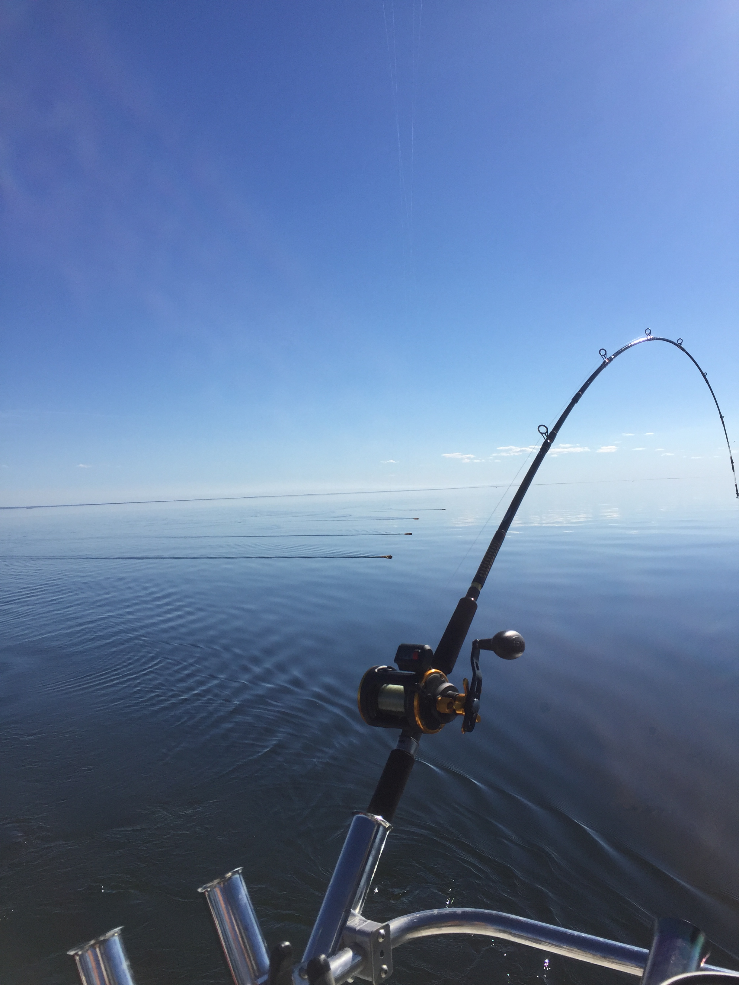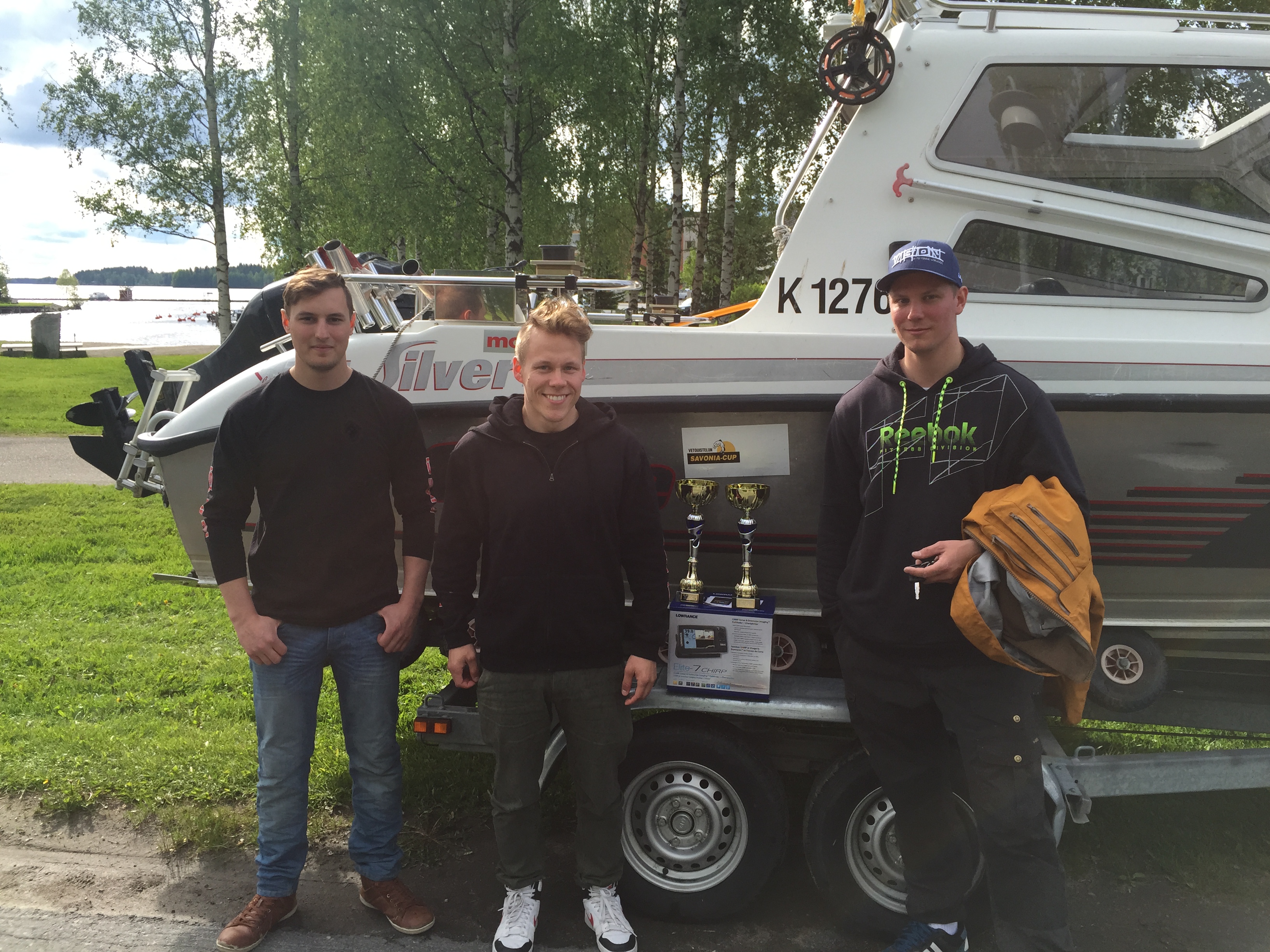 Noin puolessa välin matkaa klo 16 aikoihin aloimme tylsyyteemme katselemaan YouTubesta videoita ja melkein heti alkoi räikkä päristä. Ainoa joka kuuli pärinän oli Hene joka istui veneen takaosassa. Kala otti kiinni sivutönkköön, missä oli oranssi Dipsy Diver -syvääjä välissä. Kummastelimme taas kalan päätöstä valita lähimpänä venettä oleva syötti, kun radiosta kuulimme melkein järjestään kalan tulleen uloimpaan sivuvapaan. Kala oli jälleen todella lähellä venettä, mutta veti siimaa tasaisesti. Väsytysvuorossa oli Tomi, joka varmoin ottein pumppaili kalaa lähemmäs venettä. Kala otti muutamia vetoja lähellä venettä ja näimme, että nyt on isompi kyseessä. Haavimieheksi valikoitui kylmät hermot ja äärettömän itseluottamuksen omaava Ana, jolla tosin oli toinen jalka kipsissä, mutta se ei miehen menoa tuntunut haittaavan pätkääkään. Väsytys kesti kaikenkaikkiaan noin puolituntia ja kala alkoi olemaan valmis veneeseen. Kala taas nätisti haaviin, mutta haavin varsi sotkeutui sivuvapoihin ja Ana ei saanut sitä heti nostettua veneeseen. Ongelmana oli taas liian matala havas, mutta onneks kala saatiin kyytiin kun koko venekunta riensi auttamaan. 16kg lohi kyydissä ja venekunta onnellisena!