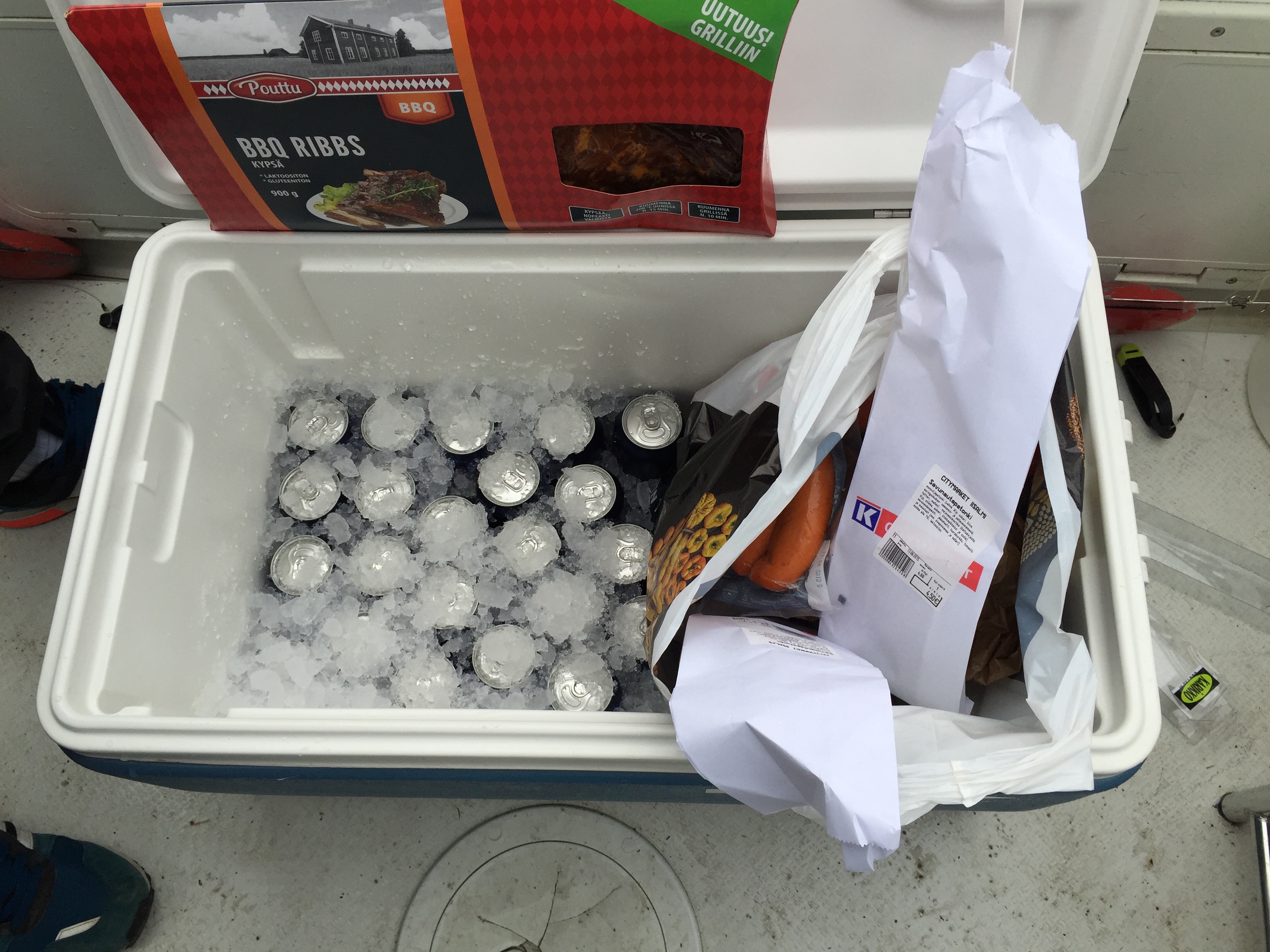 Otimme kuopiosta mukaamme arkkupakastimen, että saisimme syöttikalat ja mahdolliset saalisfileet pidettyä jäissä matkan ajan. Pakastimme ennen reissua pulloja, sekä kylmäkalleja, etteivät syöttisalakat pääsisi sulamaan. Suunitelmana oli vetää laivassa virrat pakastimeen, mutta ongelmaksi muodostui laivassa olevat virtapaikat, jotka olivat järjestään pelkkää 32A voimavirtapistokkeita. Vinkkinä muille, jotka meinaavat ottaa pakastimen mukaan: Ostakaa adapteri 32A voimavirtapistokkeelle, niin selviätte helpommalla. Löysimme kuitenkin lopulta yhden normaalin pistorasian ja huokaisimme helpotuksesta. Laivalla kävimme syömässä iltapalan ja hankimme taxfreesta hieman reissujuomaa.