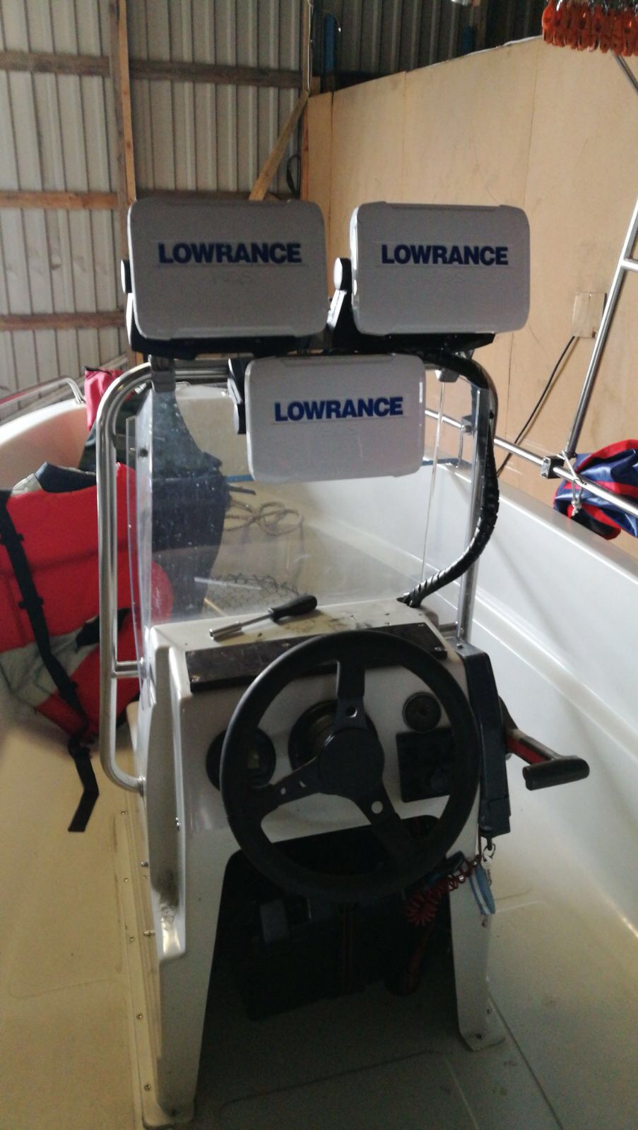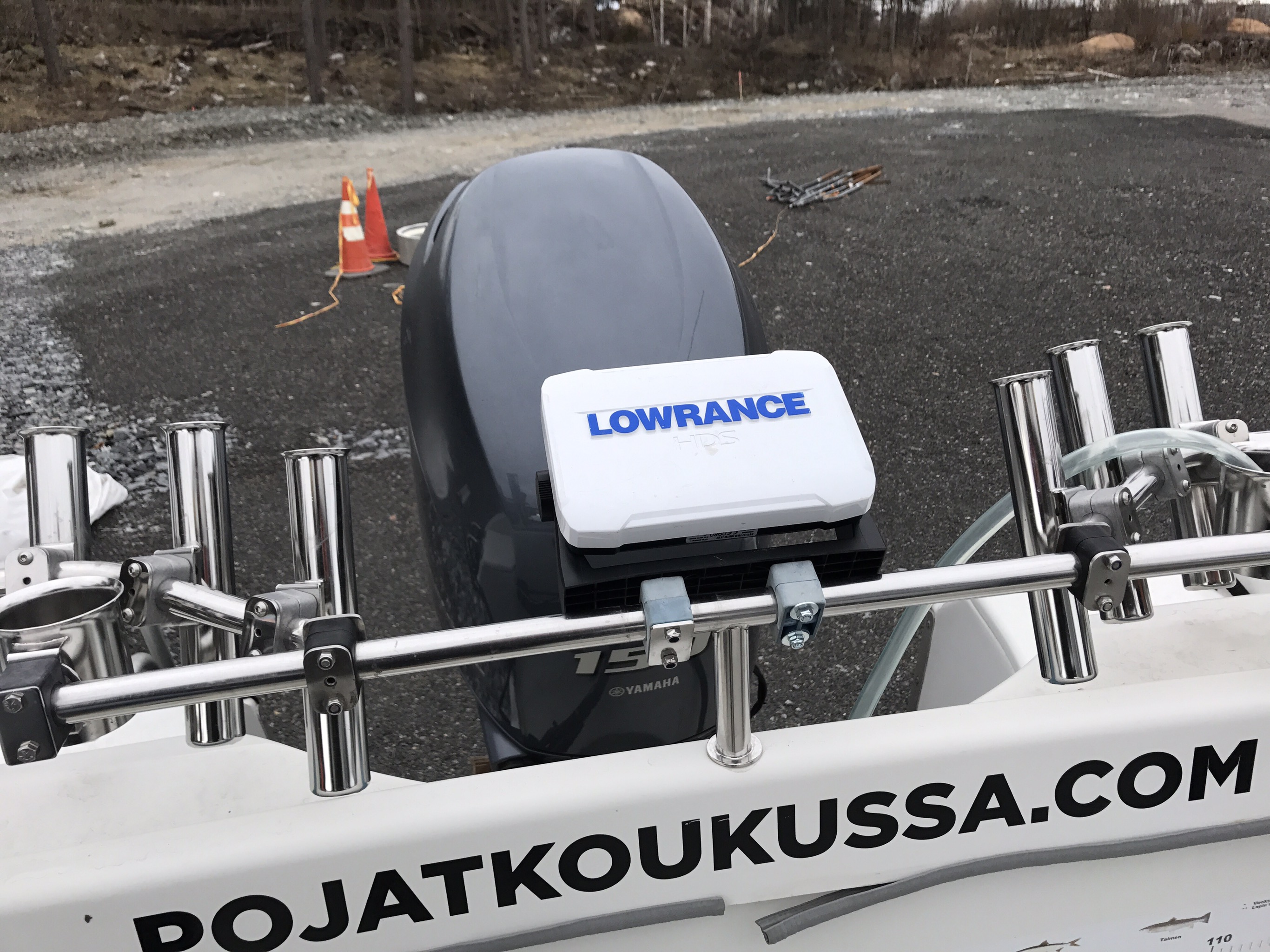 Päälaitteena toimii Lowrance HDS 7 Gen3 ja lisäruutuna Lowrance HDS 7m Gen2 touch. Kaudelle -17 setuppiin tuli vielä yksi HDS Gen2T 7″ lisää joten pulpetti alkaa sitä myöten olla aika ammuttu täyteen. Laitteet on kytketty yhteen ethernetillä ja näin näyttökuvan jakaminen ruutujen välillä on mahdollista. Takanäyttönä tulee jatkossa toimimaan aikasemmin pilkkikäyttöön hommattu Lowrance Elite-5X Chirp. Antureina viistoluotauksessa Lowrance LSS-HD-XDCR structure scan ja normaali luotaukseen 2kpl HST-HDI -antureita käytettäksi eri taajuuksilla takanäytössä ja pulpettien ruuduissa.