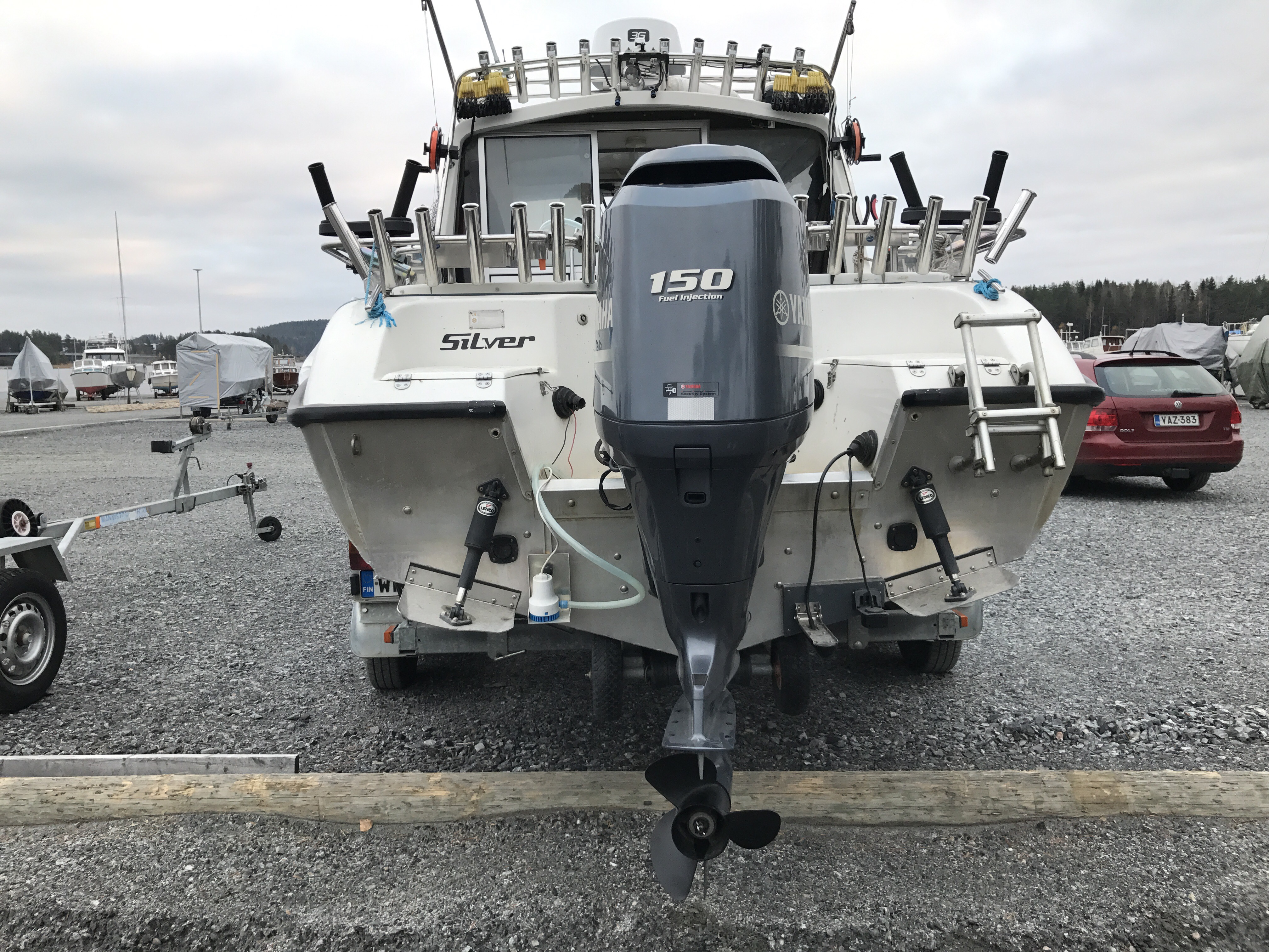 Tiimimme ykkösveneenä on Silverin kabiini, vene on jo vuosimallia 2001 eli ensimmäistä sarjaa, ja ollut meillä syksystä -06 lähtien. Koneena siinä on Mercuryn 115 EFI, vuosimalli -03, ja tämäkin on ollut samasta syksystä lähtien. Syksyllä -16 kone päivitettiin Yamahan F150 -12 koneeseen joka löytyi sopivasti käytettynä. Nyt kone on suositusalueen ylärajalta joten tehoreserviä on enemmän ja toivottavasti myös marssivauhdin kulutus pienenee. Alun pitäen vene tuli meille retkikäytöstä mutta siinä oli kuitenkin valmiina vapaputket ja autopilotti. Tässä ajassa venettä on kerennyt pikkuhiljaa varustaa mieleisekseen ja isompia suunnitelmia sen osalta ei ainakaan tällä hetkellä ole mielessä.