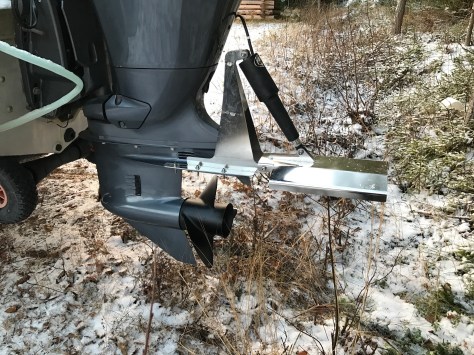 Uuteen koneeseen asensimme myös uistelujarrun, tämän ansiosta jarrupusseja ei tarvitse enää viritellä ja oikein nopeuden säätö on helpompaa. Asennus tapahtui mukavassa lähes 10 asteen pakkasessa ennen uistelemaan lähtöä, kerkesimme yhden reissun testata levyä ja se toimi kuten pitikin. Asennuksessa pitää porailla reiät moottorin kavitaatiolevyyn johon sitten jarrulevy pultataan kiinni, tämän jälkeen johto vedetään siitä keinukytkimelle ja virtoihin, eli yksinkertainen homma myös kokemattomalle. Toimintaperiaatehan uistelujarrussa on se että moottoriin asennetaan levy joka säätyy pumpulla potkurin eteen, näin ollen työntövoimaa voi säädellä kierroksia muuttamatta, säätö tapahtuu yksinkertaisesti keinukytkimestä.