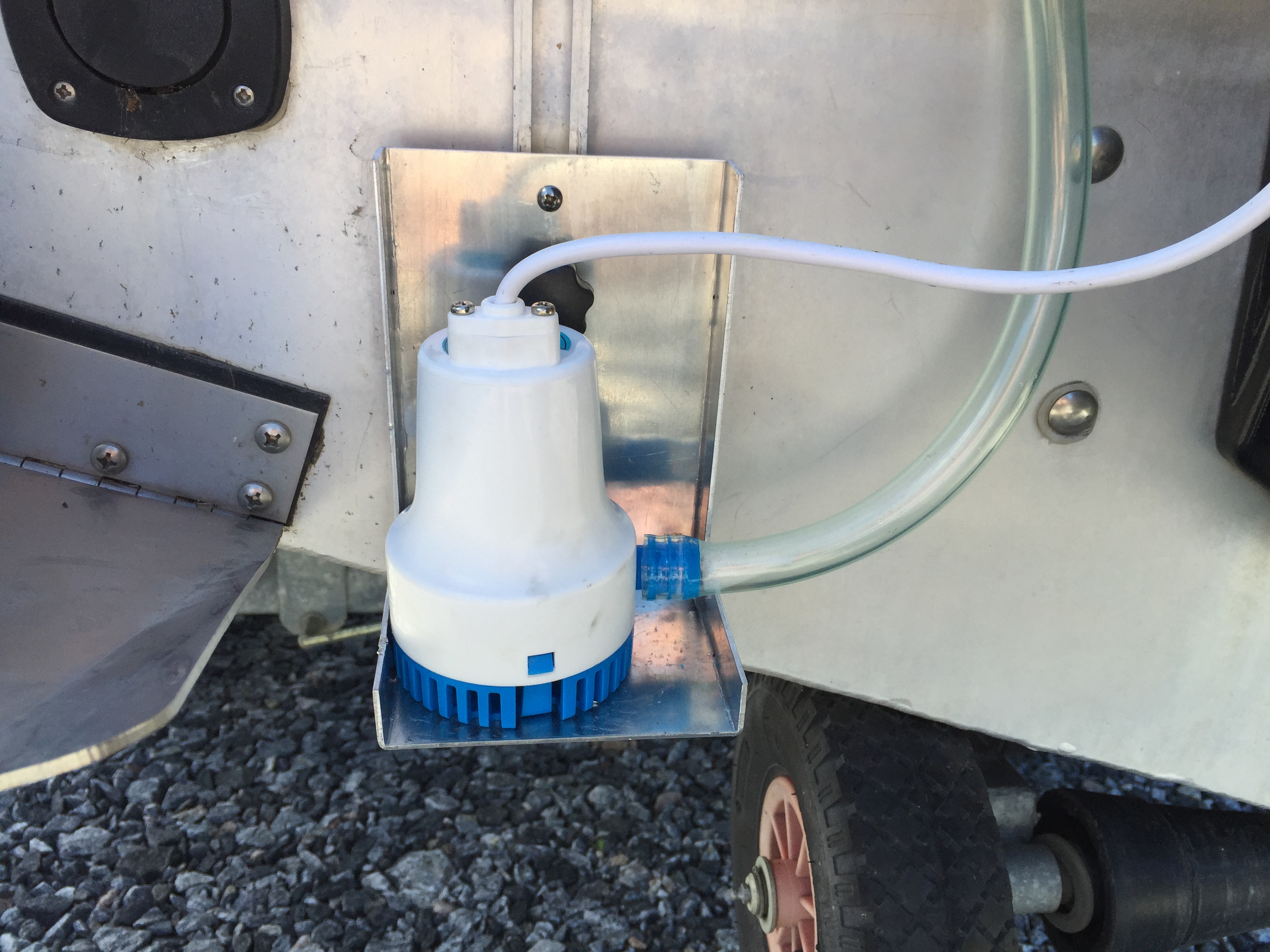 Laitoimme myös takatilaan suihkun jolla saamme huuhdottua liat suoraan pois. Kiinnittimme anturihissiin pilssipumpun josta lähtee ihan normaali puutarhaletku takatilaan. Perus pilssipumppu antaa ainakin meidän tarpeisiimme tarpeeksi suuren paineen eikä erikoispumpuille ole tarvetta.