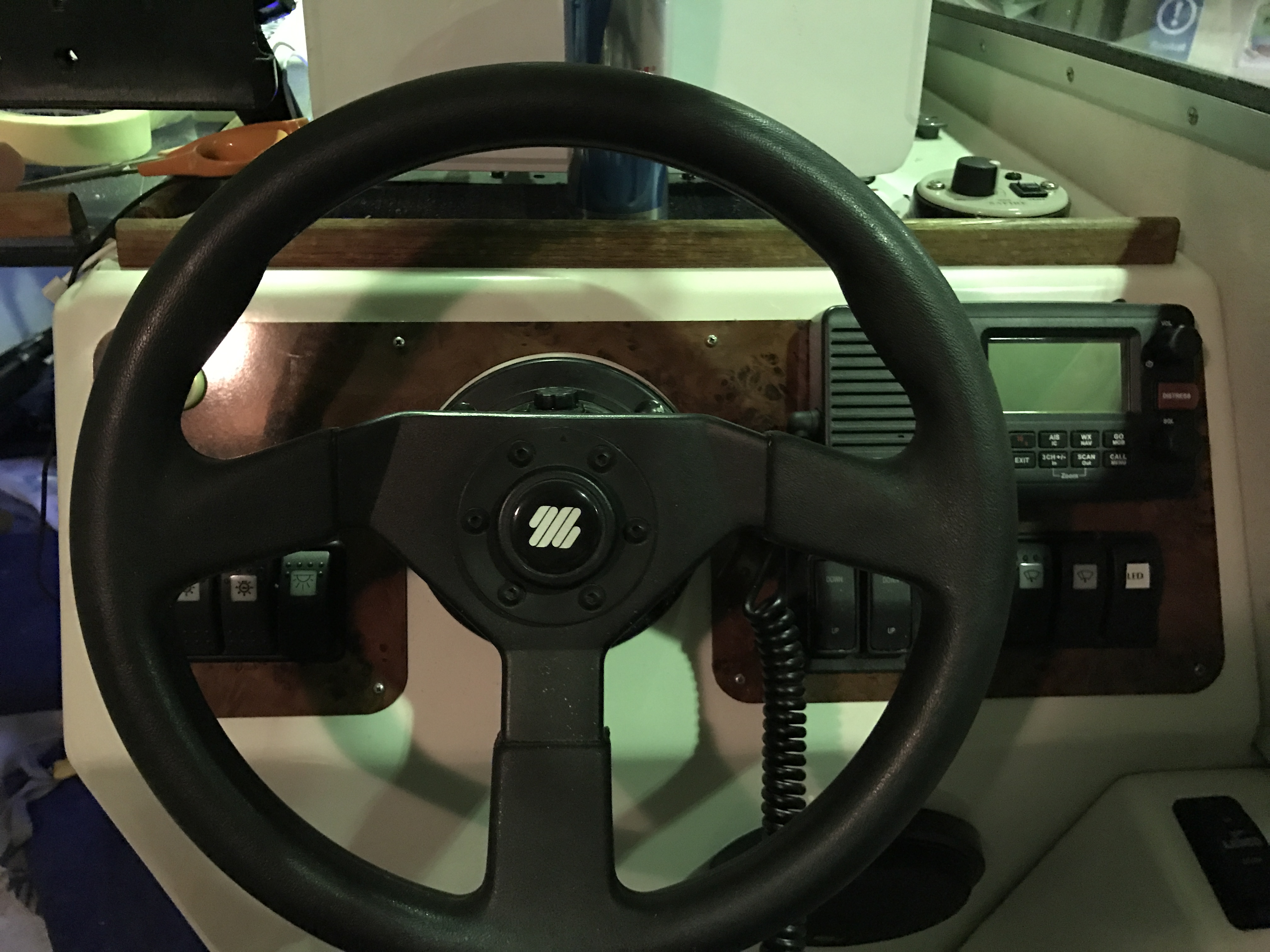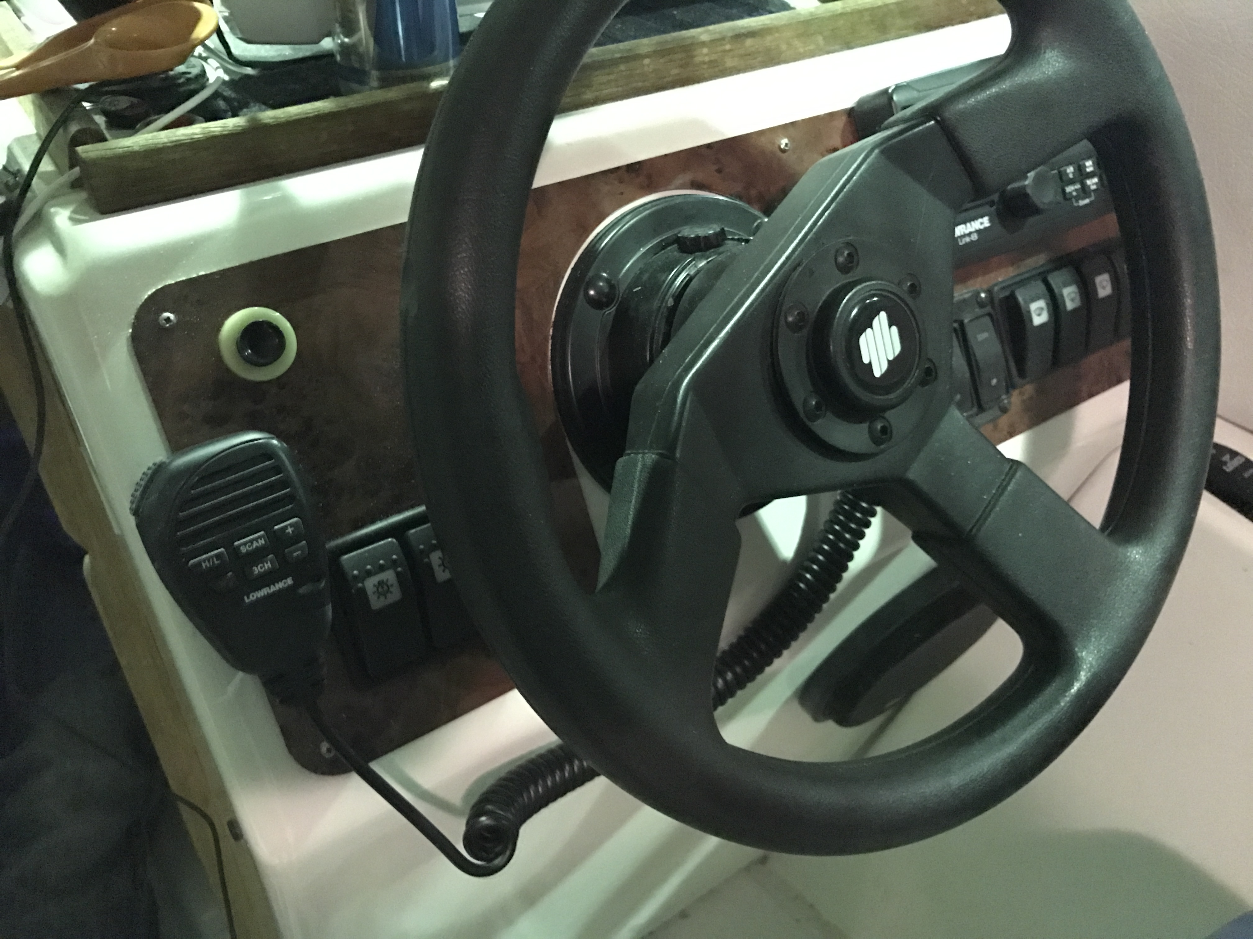 Homma aloitettiin ohjauksen tutkimisella, hydrauliohjaus on ollut vuosikaudet jäykkä ja syytä on pohdittu aika ajoin. Parina edellisenä vuotena olemme muista syistä joutuneet ilmaamaan ohjauksen, eikä tämä ole auttanut vaivaan, joten nyt lähdimme metsästämään syytä systemaattisesti. Alkuun tarkastimme kaikki hydrauliikkaletkut ja niiden kunnon ja taivutukset, sitten onko muodossa muutoksia, tukoksia yms. normaalista poikkeavaa. Tämän jälkeen testailua ratista pyöriikö tasaisesti vai nykiikö ja sitten nipat irti työsylinteristä ja katsottiin tuleeko neste ulos tasaisesti vai nykimällä. Lopulta vaihdoimme öljyn erimerkkiseen ja juoksevampaan tavaraan ja tämä ainakin jonkun verran kevensi ohjaustuntumaa, toivottavasti muutos olisi pysyvä ja toimiva myös kun kone on vedessä. Heräteostoksena vaihdoimme myös ratin, motonettiin oli tullut juuri uusi rattimalli jossa oli mukana irroitettava urakkanuppi. Aiemmin on ollut jo mielessä vaihtaa ratti malliin jossa puolat ovat tasaisesti eikä ratissa ole ”oikeaa suuntaa”, johtuen siitä että autopilotin takia rattin on aina milloin missäkin asennossa.